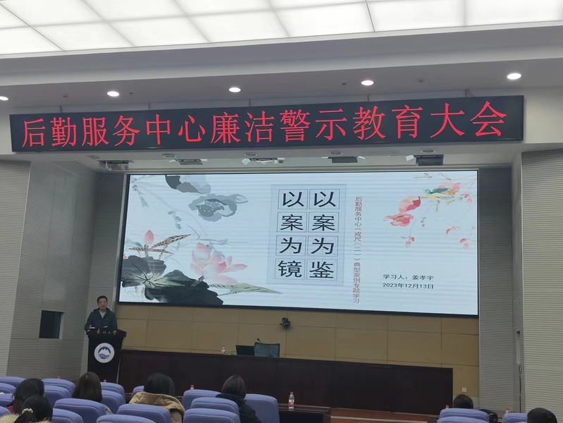 为贯彻落实学校党风廉政建设及安全生产工作部署,统筹推进后勤服务中心廉政文化和安全文化建设,切实加强中心职工廉洁意识和安全意识,积极营造风清气正、安全和谐的后勤服务环境,中心以“守安全底线·树清廉新风·强使命担当”为主题,开展“廉洁教育周”活动。12 月 13 日上午,首场报告会暨廉洁警示教育大会在综合楼822室举行,后勤服务中心科级以上管理干部、各支部纪检委员、班组长等共80余人参加会议。报告会由后勤服务中心副主任何春茂主持。
