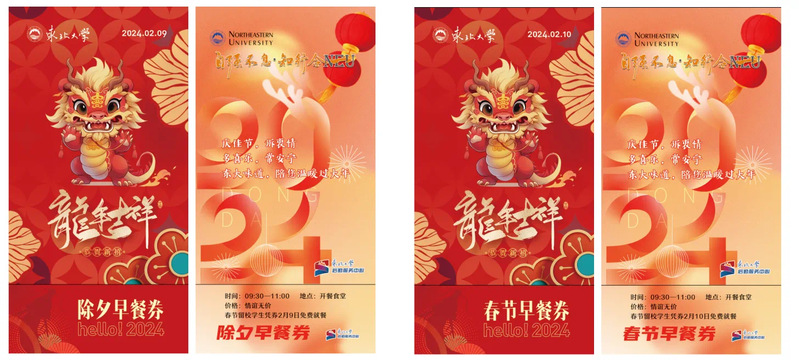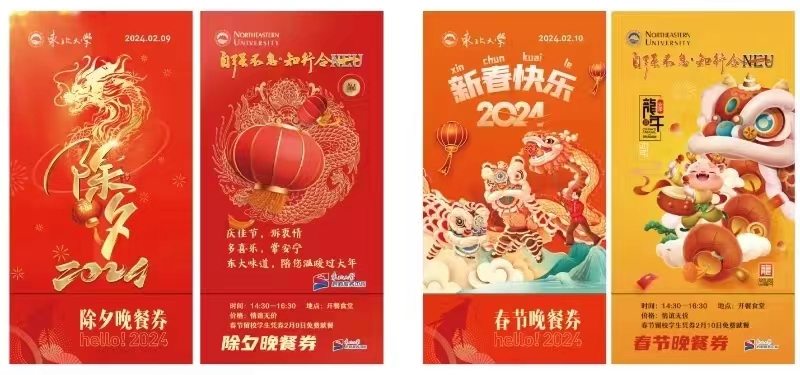瑞兔辞旧岁,祥龙迎新春,南湖校区学生城食堂二楼、浑南校区一食堂三楼,灯光明亮,喜气洋洋。为了让200余名春节留校学生过一个温馨舒适的春节,东北大学后勤服务中心于2月9日-10日,在南湖校区、浑南校区举办喜庆热闹的年夜饭活动,学生凭券可在所在校区开餐食堂,每日两次免费用餐。