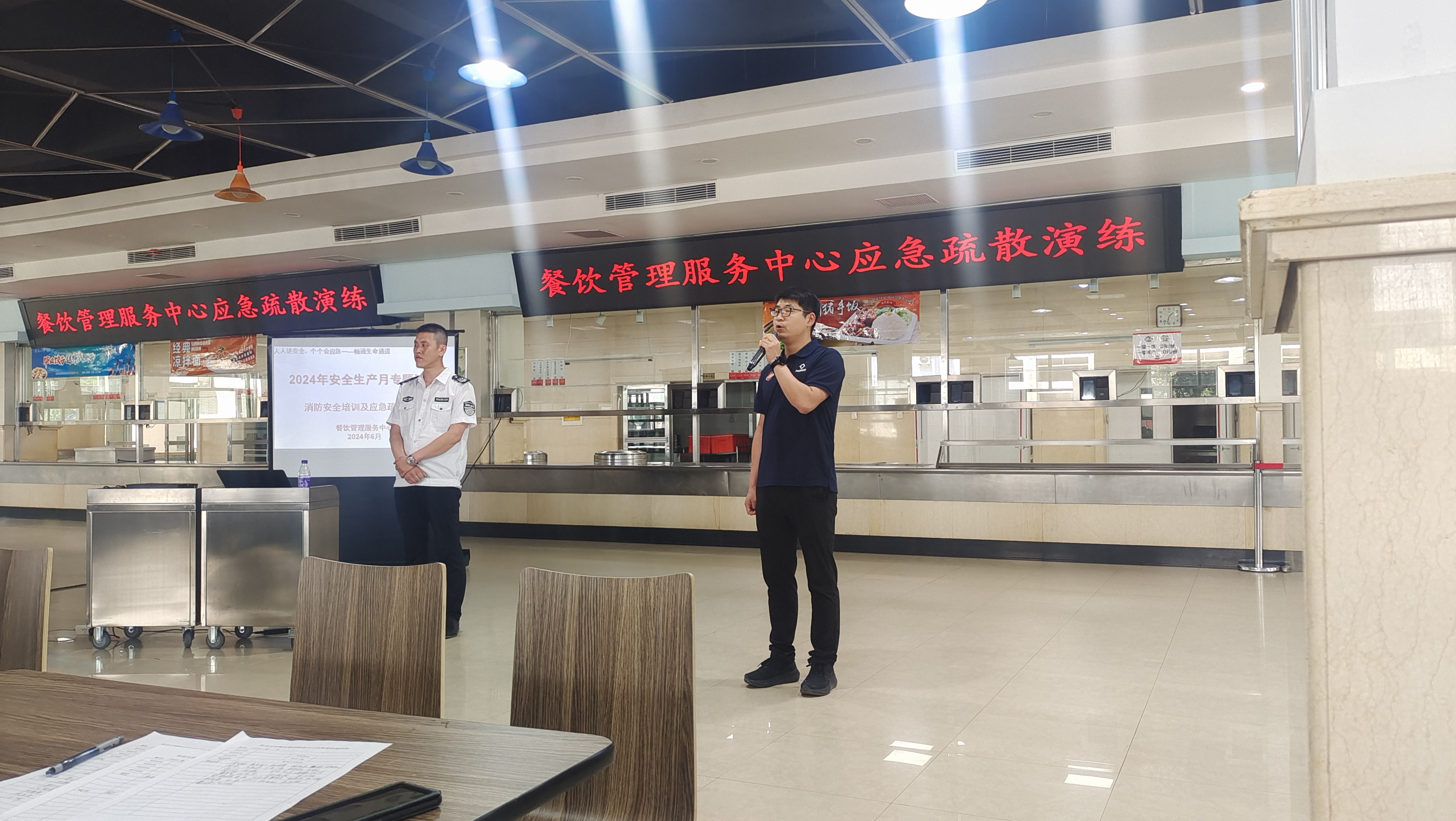 2024年6月是全国第23个安全生产月,餐饮管理服务中心积极开展以“人人讲安全、个个会应急——畅通生命通道”为主题的系列活动,除了观看安全警示教育片、举办安全知识培训、进行安全专项检查以外,餐饮管理服务中心结合实际情况,组织开展食品安全知识考核和应急疏散演练特色主题活动,提高员工面对应急事件的处置能力,强化员工对安全重要性的认识,有效防范安全生产事故的发生。