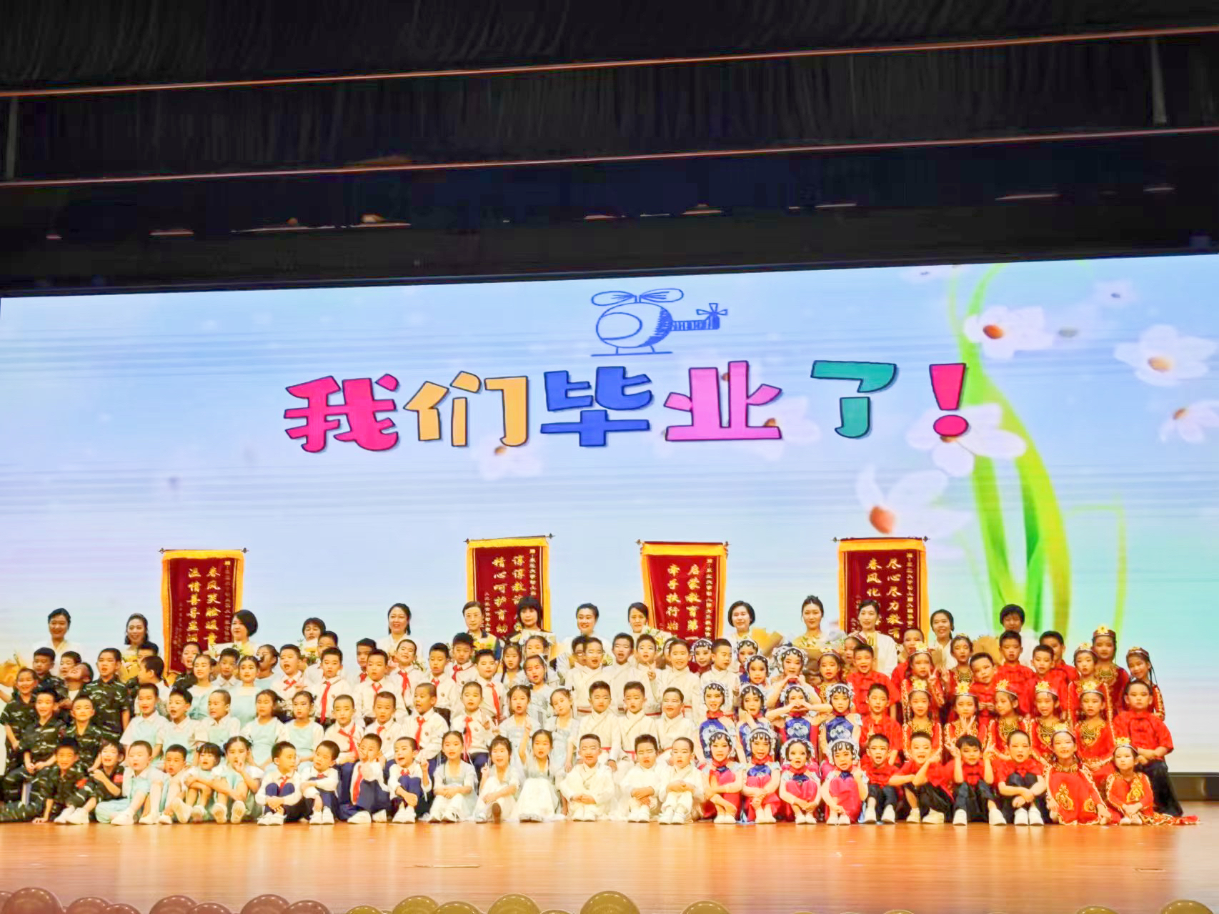 毕业典礼于孩童纯真悠扬的歌声中悄然启幕,盛装的小脸绽放着幸福的笑颜,绘就了一幅温馨动人的画卷。孩子们以灵动的舞姿演绎梦幻的童真,歌舞间流露对璀璨未来的无限憧憬与向往。